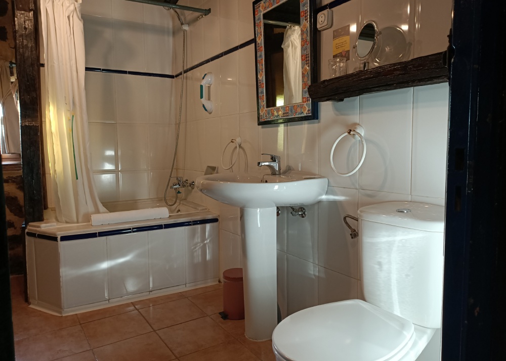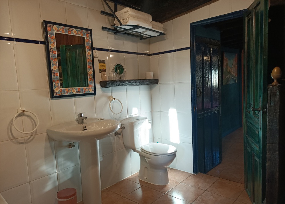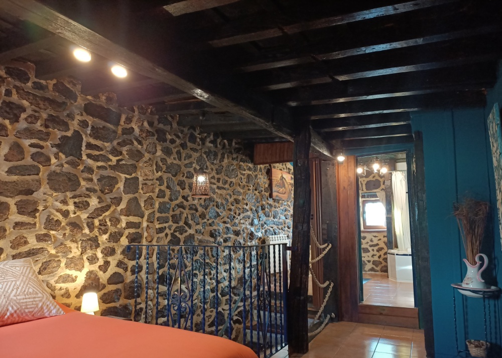 Al subir las escaleras se encuentra la habitación con una cama de 135cm, con una mesita de noche de madera maciza de castaño a cada lado y un armario con espacio para dejar los enseres personales. También se haya el baño -toallas blancas incluidas- y una pequeña ventana cuadrada que tiene bonitas vistas al pantano de Gabriel y Galán.