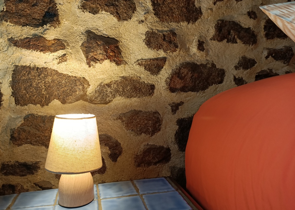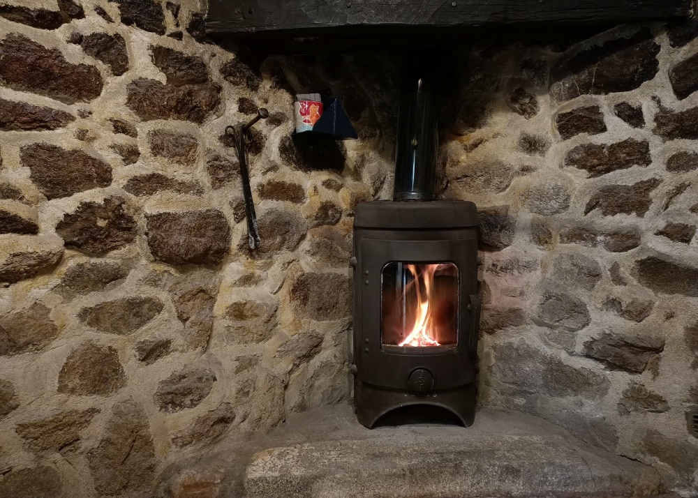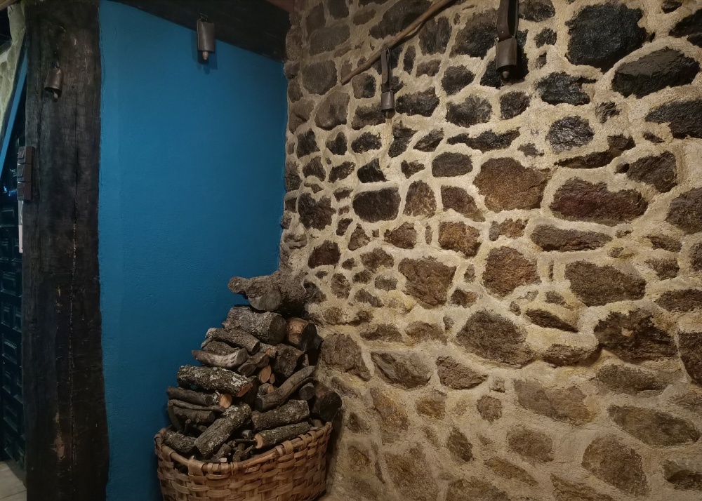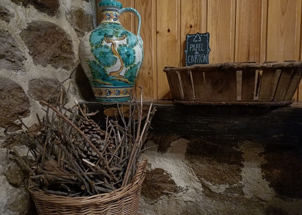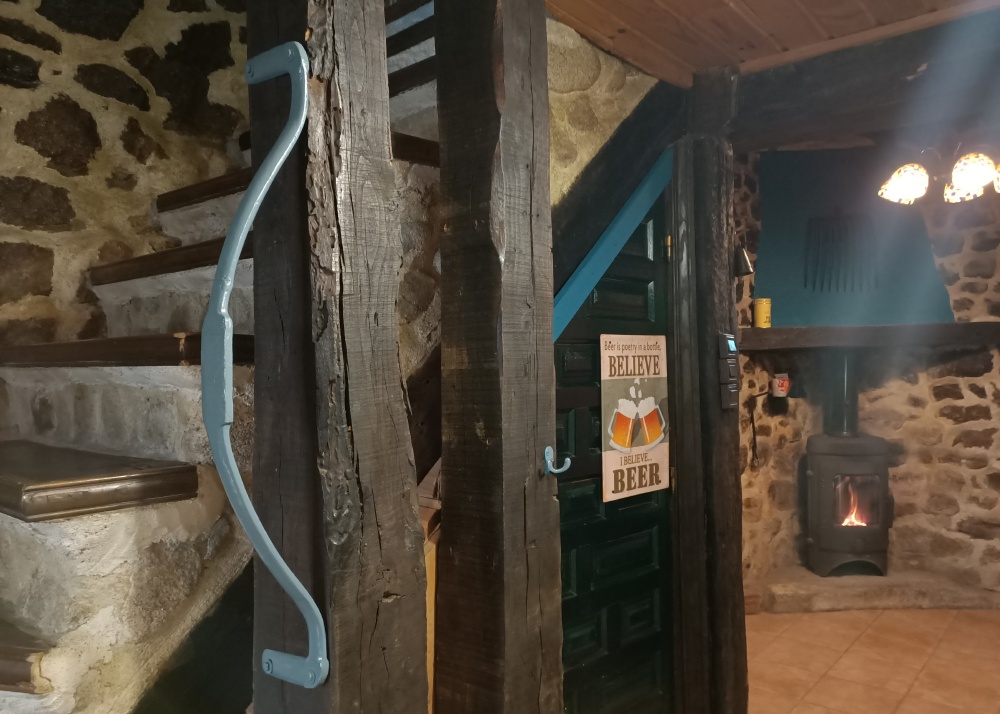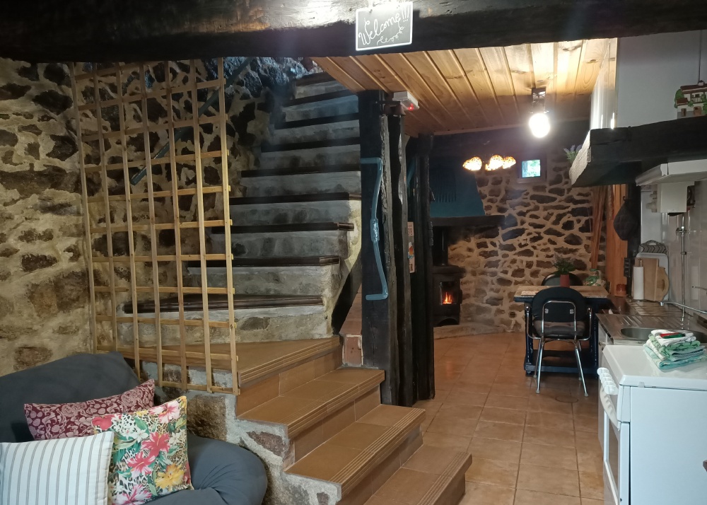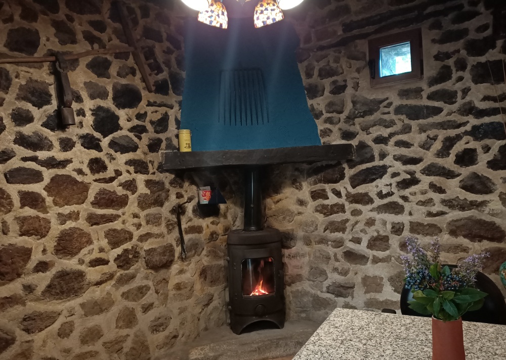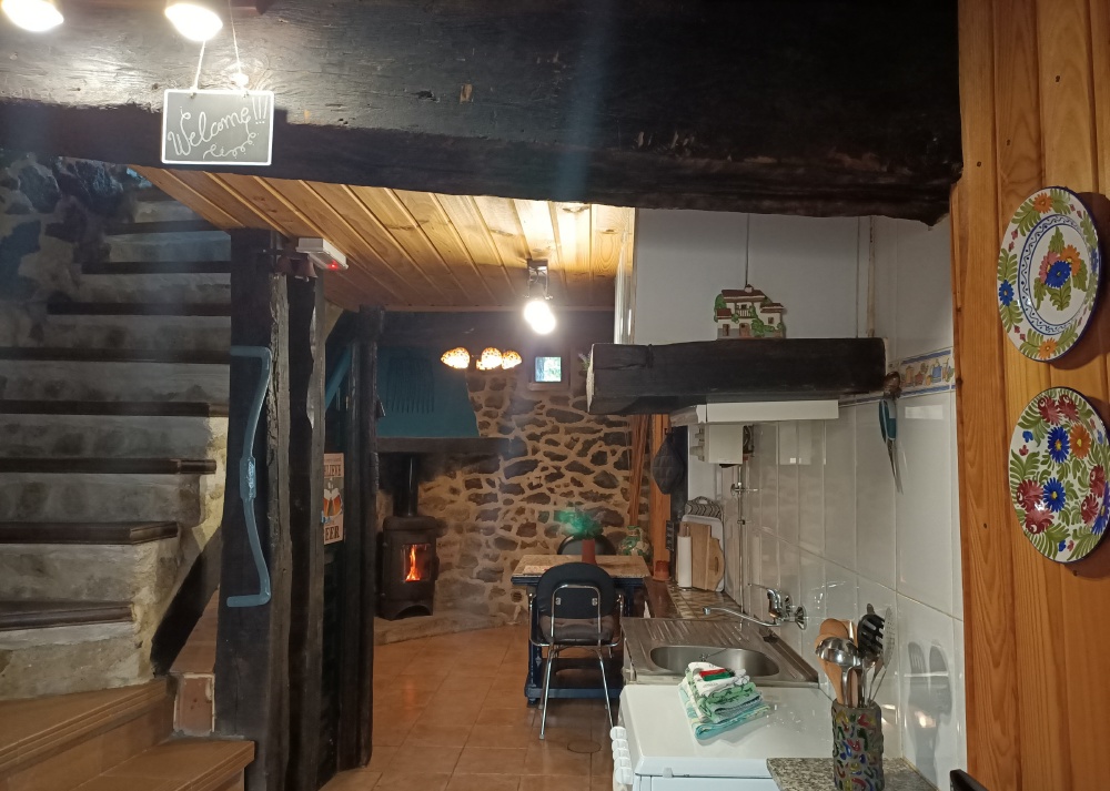 Al entrar encontramos un pequeño salón con sofá y televisión. Junto a él la cocina, que está equipada con el menaje necesario para poder prepararte un rico desayuno (a disposición cafetera italiana y tostador) antes de irte de senderismo; hacerte unos huevos fritos para la comida o reponer fuerzas con una buena cena después de una larga jornada de descubrimiento… para disfrutar de todo lo preparado, una bonita mesa a la que acompaña una estufa de leña dando, un toque de encanto al momento.